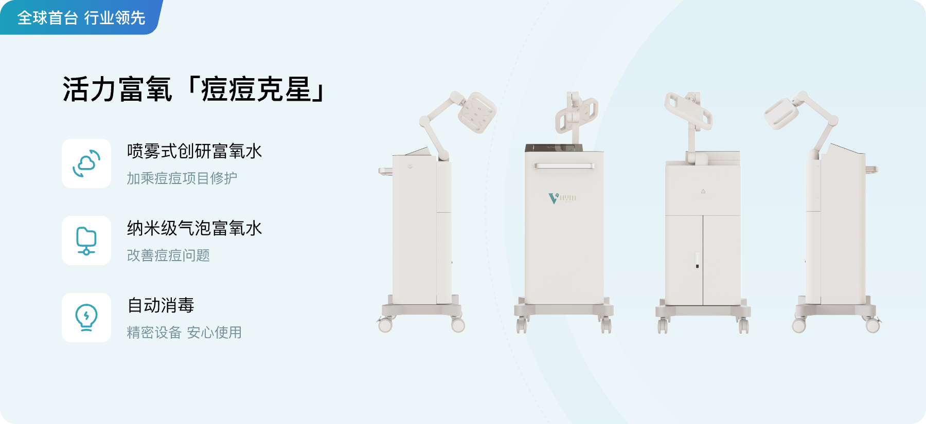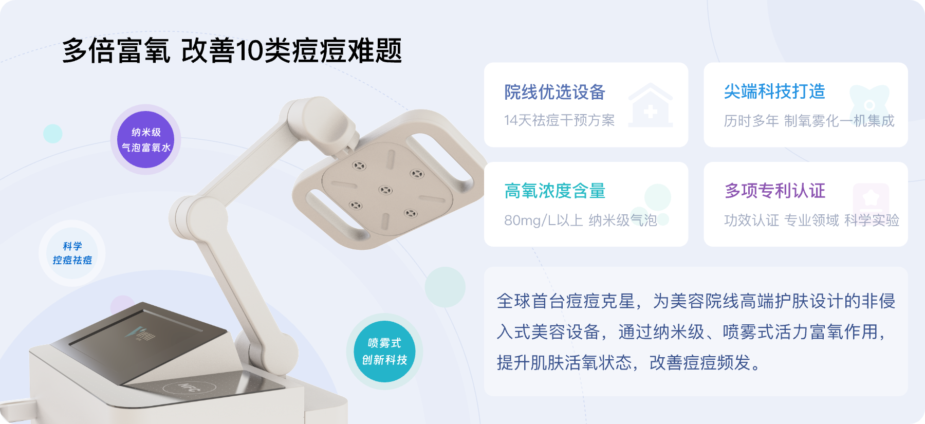 全球首台痘痘克星,为美容院线高端护肤设计的非侵入式美容设备,通过纳米级、喷雾式活力富氧作用,提升肌肤活氧状态,改善痘痘频发。