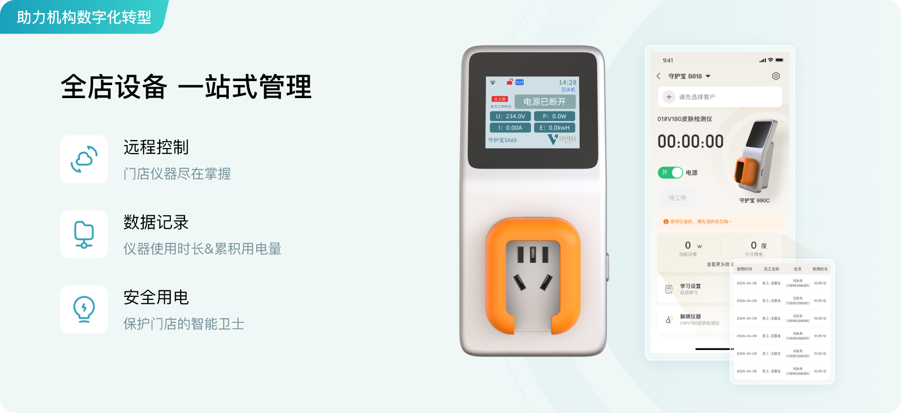 国家3C认证,专为美容仪器研发的智能插座,一站式管理机构设备,实时掌握设备数据,助力机构数字化转型,实现门店仪器操作规范化、电能利用可视化,用电数据安全化。